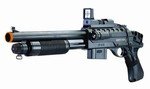 Airsoft Shotgun w/ LaserPump action airsoft shotgun w/ red dot laser beam and mock scope. Comes with starter pack of pellets, safety glasses and 3 AG13 batteries for laser. Hard shooting gun, fires at approximately 230 FPS. Has a mock clip. Pellets load into top of gun. Holds about 30-40 rounds. Spring loaded, but will shoot as fast as you can pump to reload. 12 pcs per master case.Please note this gun shoots very hard and very straight. Do not shoot at humans or animals. Comes with orange tip, as required by law. Measures approximately 24 inches in length. Comes gift boxed Read more...